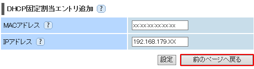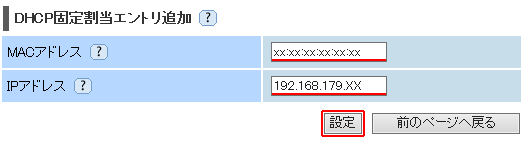 - ご利用の環境に合わせてIPアドレスを変更してください。DHCP固定割当が動作するためには、AtermのDHCPサーバが割当てる範囲内のIPアドレス(初期値:192.168.179.2~192.168.179.33)である必要があります。それ以外のIPアドレスでも設定可能ですが、割当範囲外のため、設定は無効になります。
