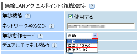- 初期値は2.4GHzで無線通信する設定のため、通常は「標準(2.4GHz)」を選択してください