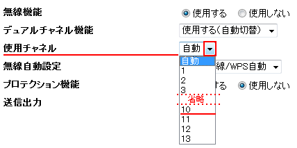 - 他の無線LANからの影響を避けるには、そのチャネルから4チャネル以上(安定した通信を行うためには5チャネル以上)空けることをお勧めします。現在、使用中のチャネルは、左メニューの「情報」-「現在の状態」にてご確認いただけます