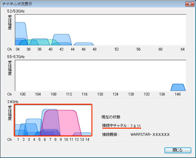 - 「受信強度」の中の赤いグラフが「接続中チャネル」です