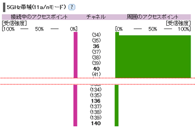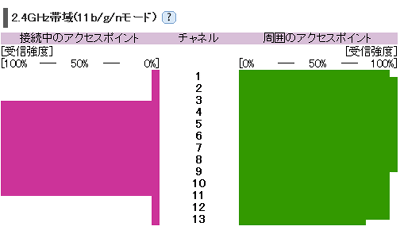 - 赤いグラフはWL300NE-AGの使用チャネル、緑のグラフは周囲のAterm親機のチャネルです
