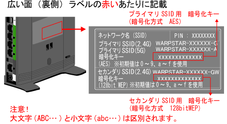動作モード プライマリSSID(暗号化方式:AES) セカンダリSSID(暗号化方式:WEP) 2.4GHz WARPSTAR-XXXXXX-G WARPSTAR-XXXXXX-GW 5GHz※2 WARPSTAR-XXXXXX-A WARPSTAR-XXXXXX-AW ※2 5GHzにはJ52・W52・W53・W56の4つがあり、タイプが異なると通信できません。