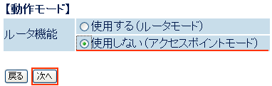 1.「ルータ機能」-「使用しない(アクセスポイントモード)」を選択し、 「次へ」をクリックします
