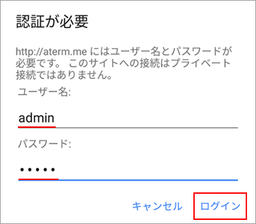ユーザー名(上段)には、「admin」と半角小文字で入力し、パスワード(下段)には、手順2で設定した管理者パスワードを入力してください。