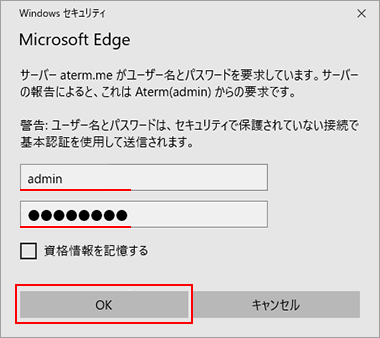 ユーザー名とパスワードを入力し、【OK】ボタンを押します。