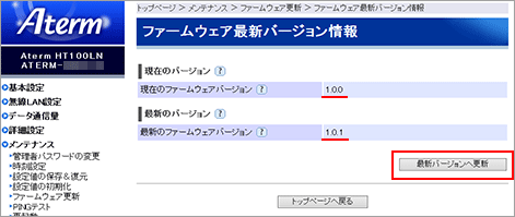 『現在のバージョン』から、「現在のファームウェアバージョン」を確認します。
