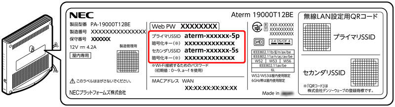 19000T12BEに接続する場合は、端末のWi-Fi(無線)設定画面で「プライマリSSID」に記載の『aterm-xxxxxx-5p』、または「セカンダリSSID」に記載の『aterm-xxxxxx-5s』を選択してください。