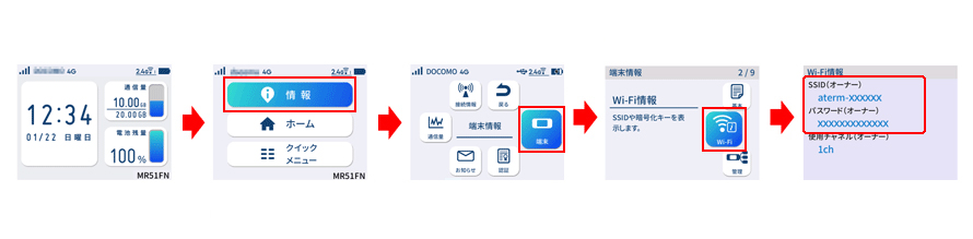 ディスプレイのTOP画面で△▽(選択)ボタンを押したあとに『情報』-『端末』-『Wi-Fi』を順番に選択すると、ネットワーク名(SSID)と暗号化キーが表示されます。