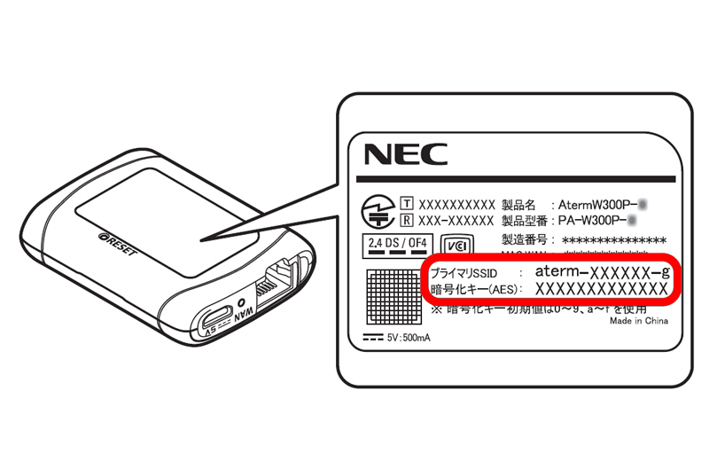 W300P本体に貼り付けられているラベルに、ネットワーク名(SSID)と暗号化キーが記載されています。(*1)