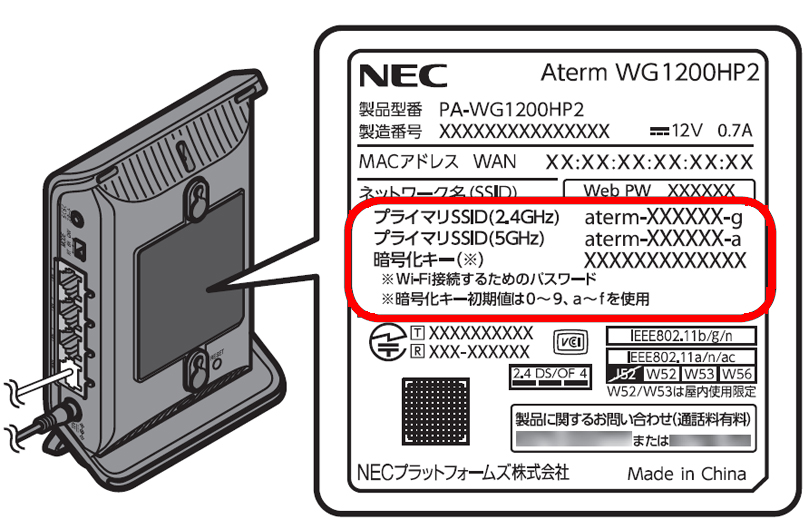 WG1200HP2本体に貼り付けられているラベルに、ネットワーク名(SSID)と暗号化キーが記載されています。(*1)