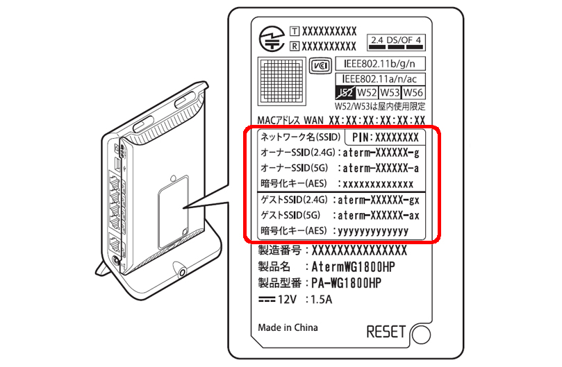WG1800HP / WG1400HP本体に貼り付けられているラベルに、ネットワーク名(SSID)と暗号化キーが記載されています。(*1)