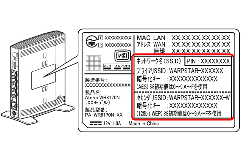 WR8170N本体に貼り付けられているラベルに、ネットワーク名(SSID)と暗号化キーが記載されています。(*1)