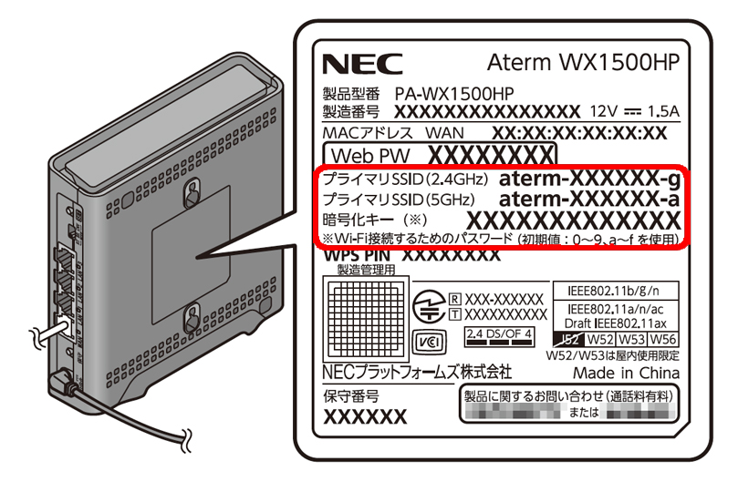 WX1500HP本体に貼り付けられているラベルに、ネットワーク名(SSID)と暗号化キーが記載されています。(*1)