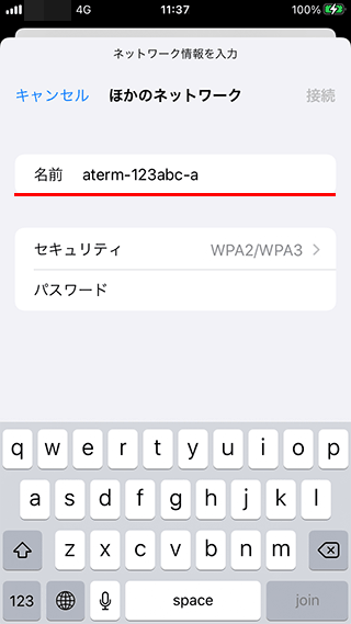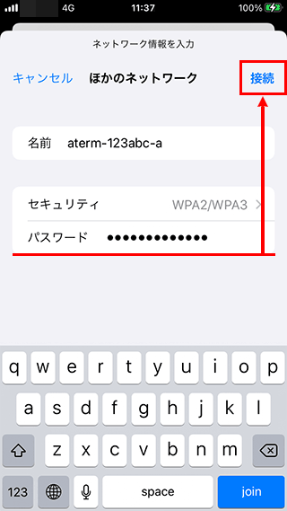 * iPhone / iPod touchはキーボードの【Join】、iPadはキーボードの【接続】をタップしても先に進めます。