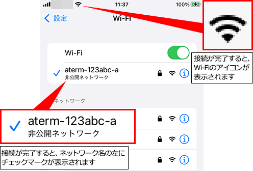 Atermのネットワーク名(SSID)の左側に、チェックマークが表示されます。