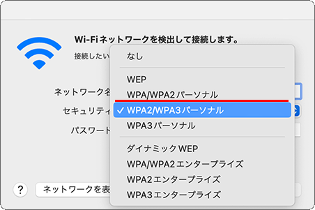 「セキュリティ」で、WPA/WPA2パーソナル(*)またはWPA2/WPA3パーソナルを選択してください。