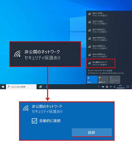 ネットワーク(SSID)一覧が表示されますので、最下部にある「非公開のネットワーク」を選択して【接続】ボタンを押してください。