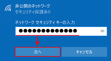 ESS-IDステルスを有効にしているAterm親機の暗号化キーを入力して、【次へ】ボタンを押してください。
