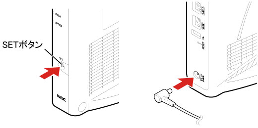 SETボタンを押しながら(押したままの状態で)、ACアダプタのプラグを差し込み電源を入れてください。
