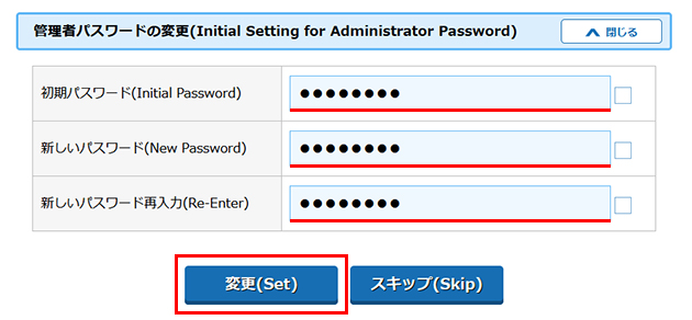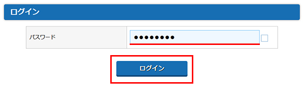 ※ 管理者パスワードの初期値は、初回または初期化直後のログイン時に手順上変更を行いますので、2回目以降のログイン時は、変更後のパスワードを入力してください。