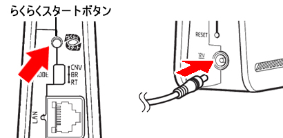 らくらくスタートボタンを押しながら(押したままの状態で)、ACアダプタのプラグを差し込み電源を入れてください。
