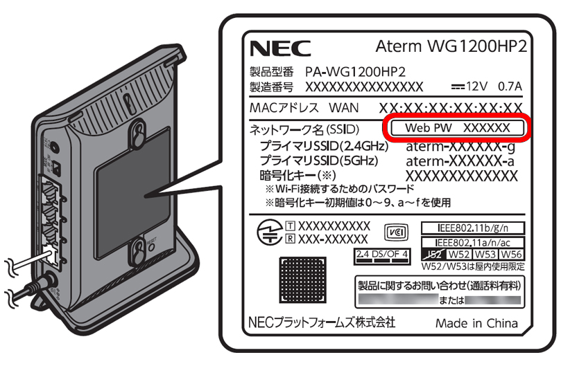 WG1200HP2 の管理者パスワード(Web PW)の記載箇所