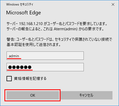 ユーザー名に半角小文字で「admin」、パスワードに管理者パスワードを入力して、【OK】ボタンを押してください。