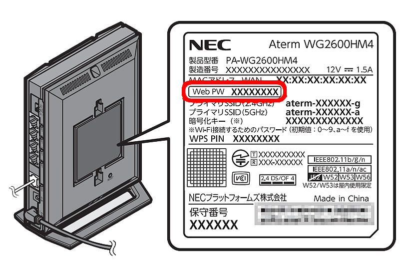 WG2600HM4 の管理者パスワード(Web PW)の記載箇所