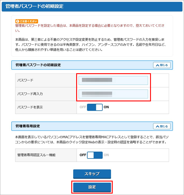 管理者パスワードは、クイック設定Webを開く際に、必要になりますので忘れないようにしてください。