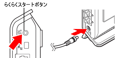らくらくスタートボタンを押しながら(押したままの状態で)、ACアダプタのプラグを差し込み電源を入れてください。