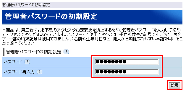 ※ 管理者パスワードは、クイック設定Webの「管理者パスワードの初期設定」または「管理者パスワードの変更」画面で設定したパスワードです。