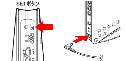 SETボタンを押しながら(押したままの状態で)、ACアダプタのプラグを差し込み電源を入れてください。