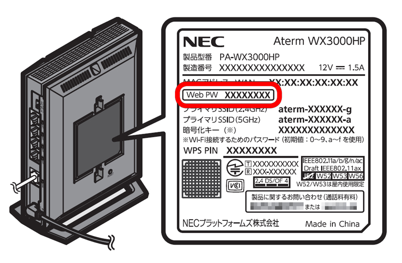 WX3000HP の管理者パスワード(Web PW)の記載箇所