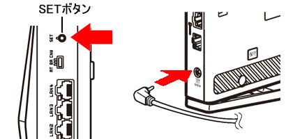 SETボタンを押しながら(押したままの状態で)、ACアダプタのプラグを差し込み電源を入れてください。