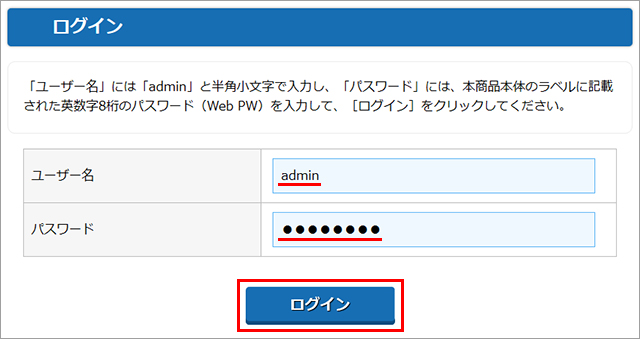 ユーザー名に半角小文字で「admin」、パスワードに管理者パスワードを入力して、【ログイン】ボタンを押してください。