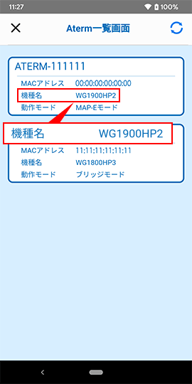検索が完了すると、クイック設定WebにアクセスできるAtermの機種名が、一覧に表示されます。