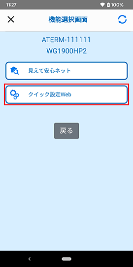 「クイック設定Web」をタップすると、クイック設定Webのログイン画面にアクセスします。