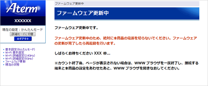 この画面が表示されている間は、ファームウェアの更新中または再起動中ですので、絶対にAtermの電源を切らないようにしてください。