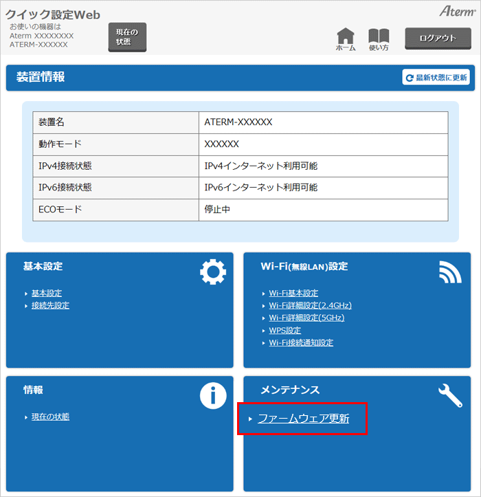 クイック設定Webのホーム画面で、『メンテナンス』-『ファームウェア更新』を選択してください。