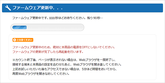 この画面が表示されている間は、ファームウェアの更新中または再起動中ですので、絶対にAtermの電源を切らないようにしてください。