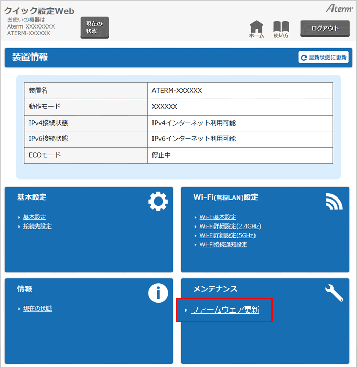クイック設定Webのホーム画面で、『メンテナンス』-『ファームウェア更新』を選択してください。