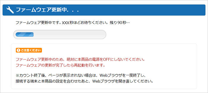 この画面が表示されている間は、ファームウェアの更新中または再起動中ですので、絶対にAtermの電源を切らないようにしてください。