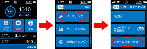 ディスプレイの「設定」-「メンテナンス」-「ファームウェア更新」を順番にタップしてください。