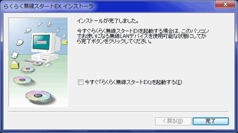 「今すぐ「らくらく無線スタートEX」を起動する」にチェックを入れた状態で、【完了】ボタンを押した場合は、画面を閉じた直後に自動でらくらく無線スタートEXが起動します。