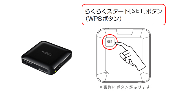 無線LAN端末側のマニュアルに記載されているWPSの手順で、『WPSボタン』『WPSのプッシュボタン』などで説明されているものは、W500Pでは『らくらくスタートボタン』のことを指しています。