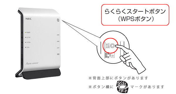 無線LAN端末側のマニュアルに記載されているWPSの手順で、『WPSボタン』『WPSのプッシュボタン』などで説明されているものは、WF800HPでは『らくらくスタートボタン』のことを指しています。