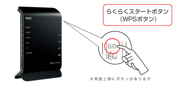 無線LAN端末側のマニュアルに記載されているWPSの手順で、『WPSボタン』『WPSのプッシュボタン』などで説明されているものは、WG1200HS4では『らくらくスタートボタン』のことを指しています。