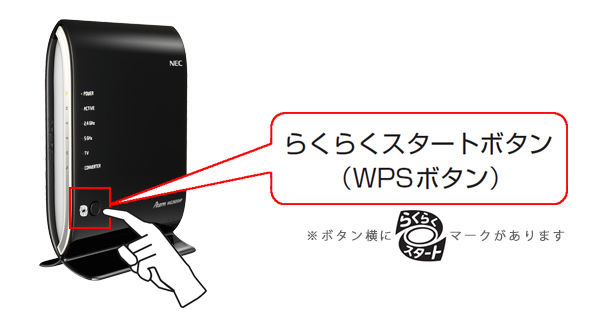 無線LAN端末側のマニュアルに記載されているWPSの手順で、『WPSボタン』『WPSのプッシュボタン』などで説明されているものは、WG2600HPでは『らくらくスタートボタン』のことを指しています。
