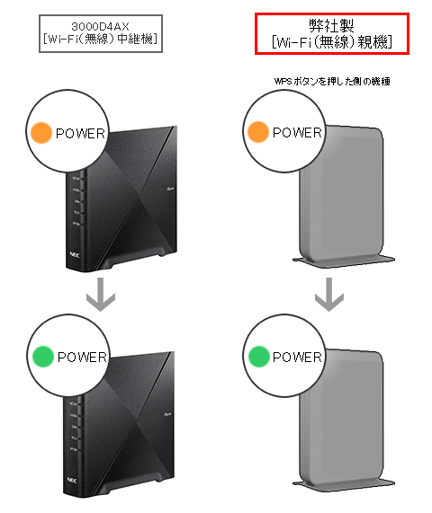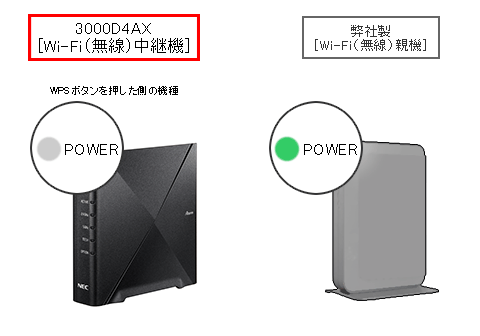 3000D4AXのPOWERランプ点滅後、1分以内に弊社製Wi-Fi(無線)親機の「WPSボタン」を長押ししてください。