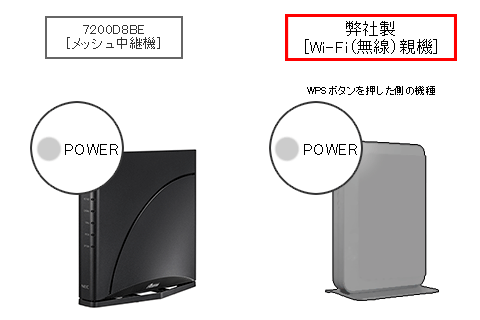 7200D8BEのPOWERランプ点滅後、1分以内に弊社製メッシュ親機の「WPSボタン」を長押ししてください。